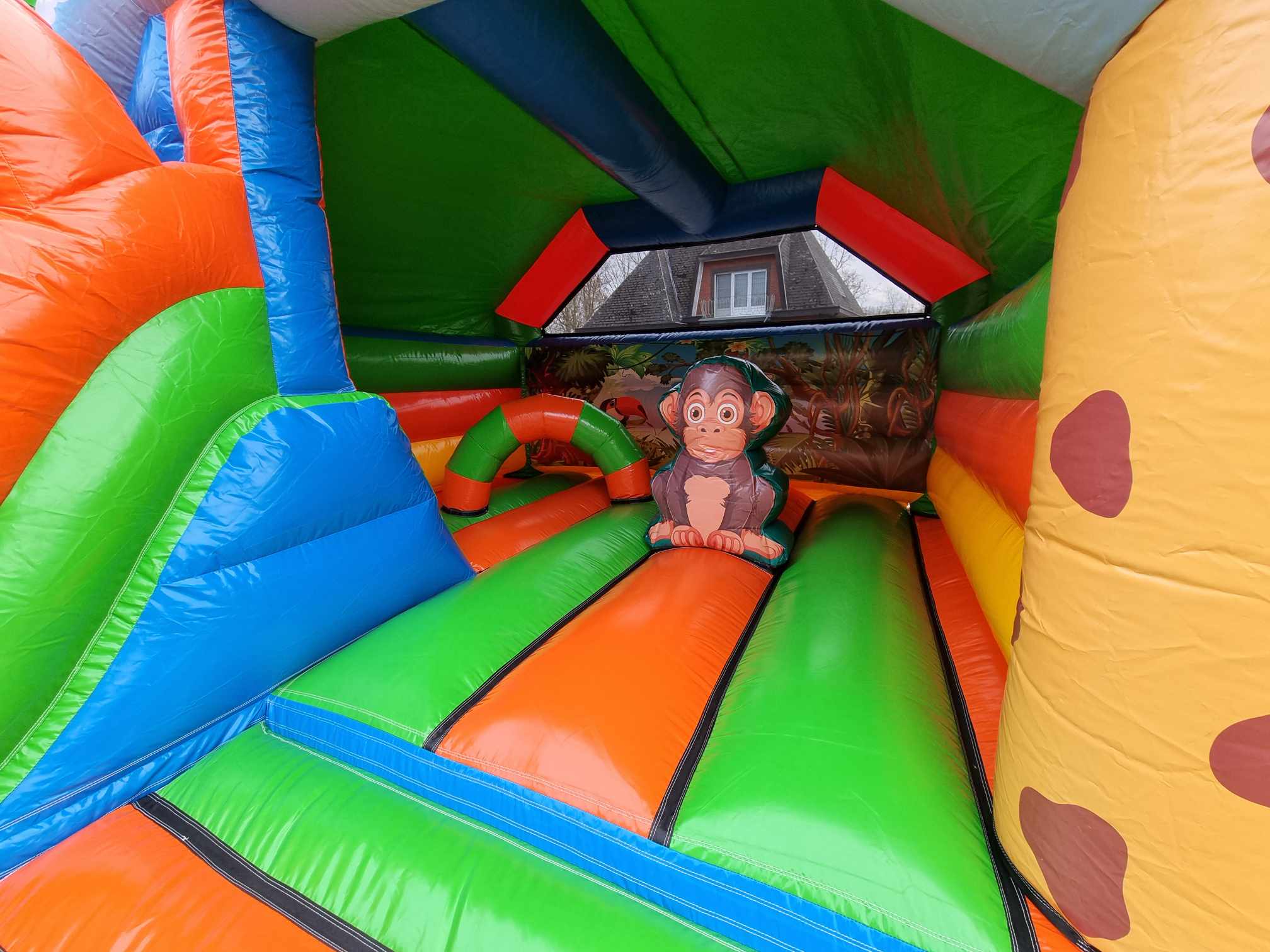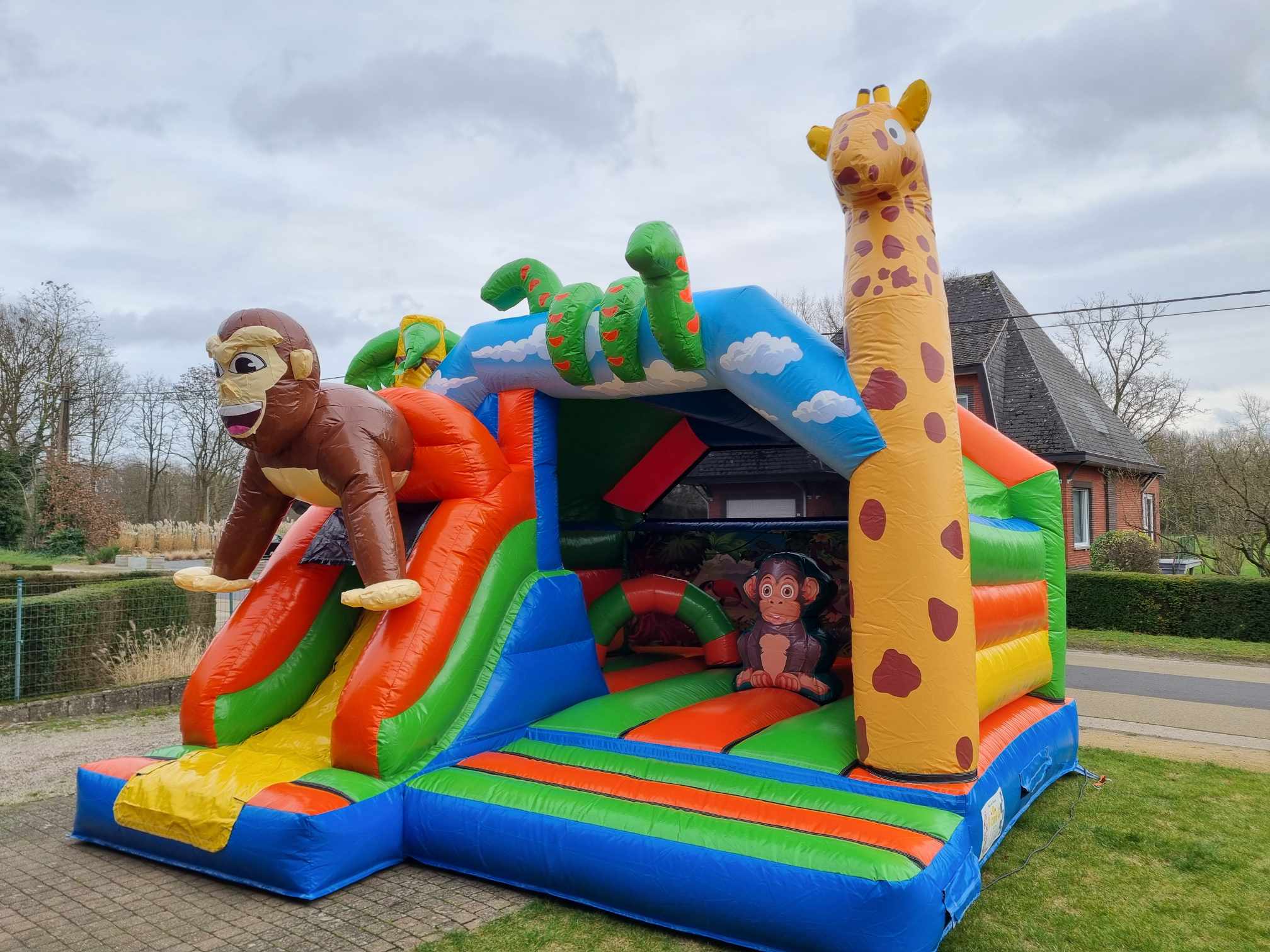 Breng de jungle tot leven op jouw feest met dit stoere Gorilla Springkasteel met glijbaan!