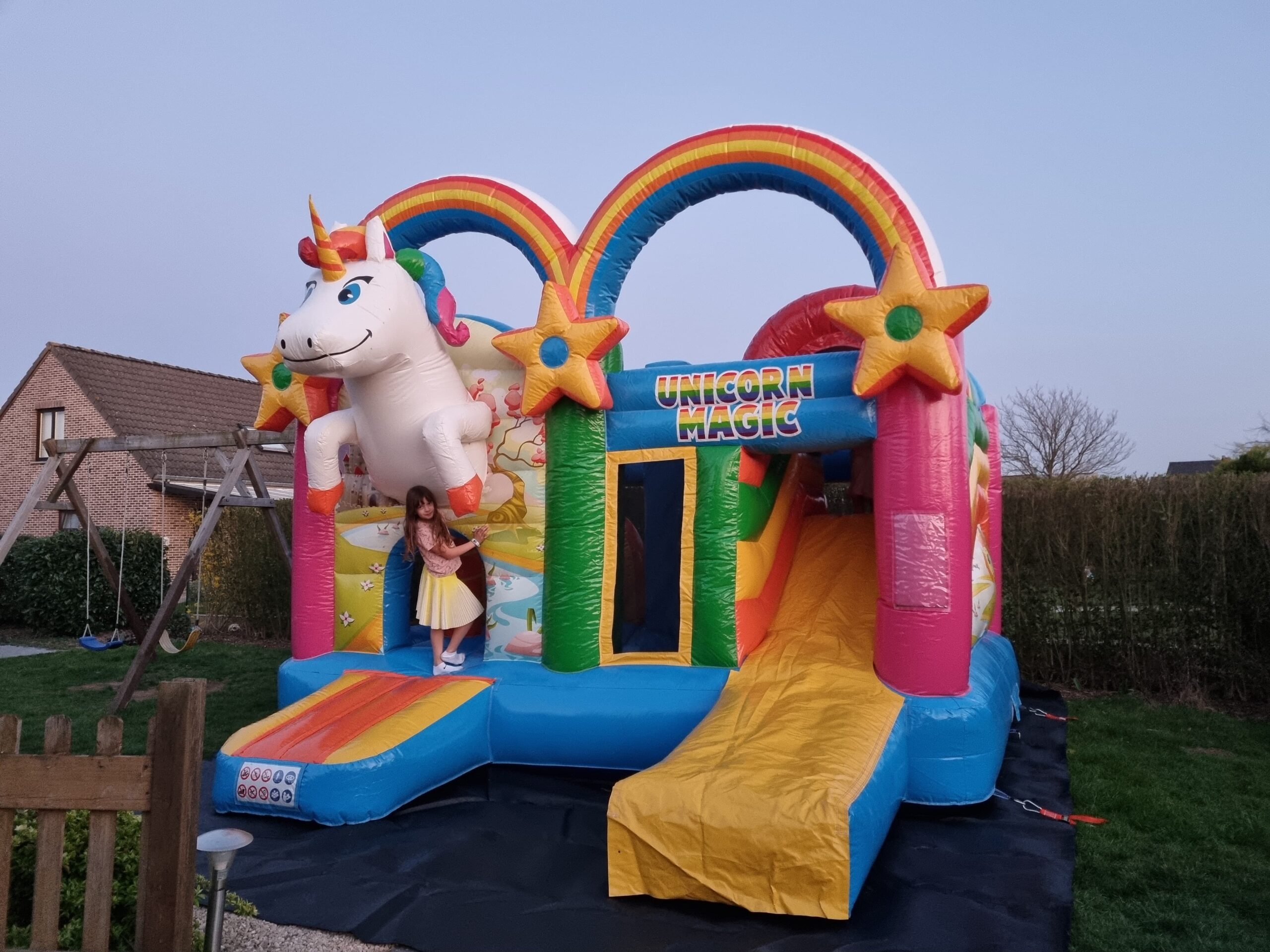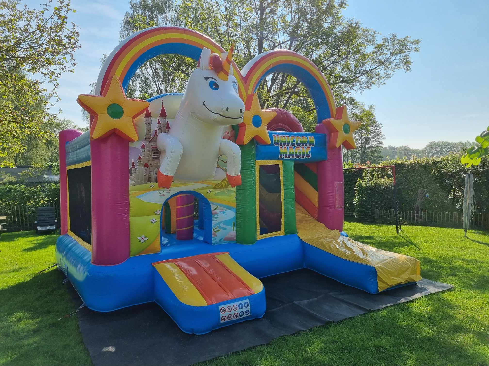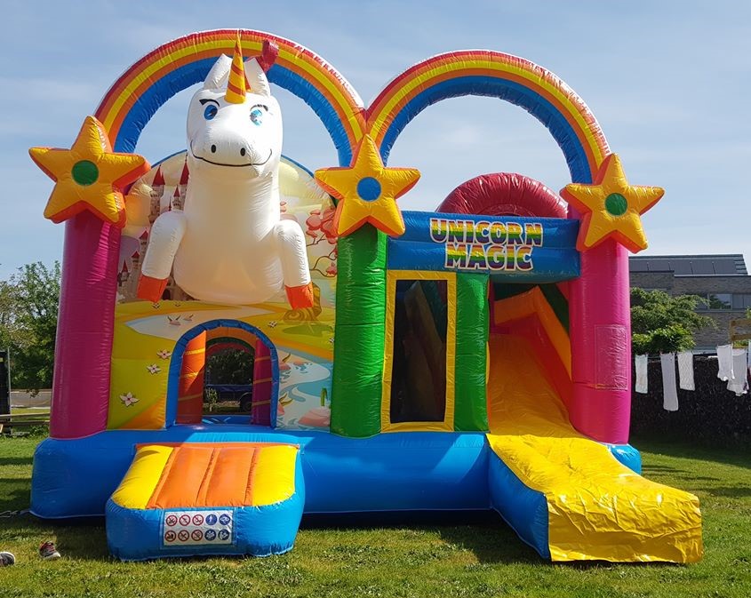 Met zijn grote schattige eenhoorn, kleurrijke regenbogen en glijbaan is dit springkasteel een droom die uitkomt voor elke kleine eenhoorn fan.
